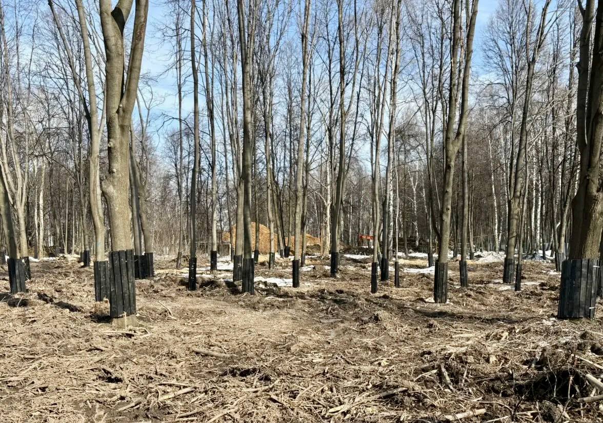 Сейчас в парке вырыт котлован под площадку, проложены коммуникации для водоотведения. Завершается санитарная прочистка: удаляют сорную поросль, американский клён, сухие и больные деревья. Для защиты здоровых насаждений устанавливают специальные ограждения«короба».