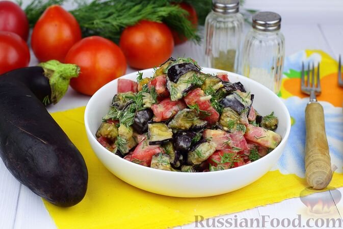 Эстетические и гастрономические удовольствия подарит салат с запечёнными баклажанами, помидорами и зеленью. Баклажаны запекаются в нарезанном виде и затем дополняются свежими помидорами и ароматным укропом, заправляются оригинальным соусом из сметаны, майонеза и соевого соуса.