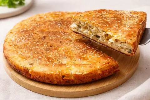 Начинка состоит из квашеной и свежей капусты, тщательно смешанных с грибами и вареными яйцами. Результат — сочная и ароматная завершающая нота с приятной кислинкой, которая не оставит равнодушными любителей домашней кухни. Такой пирог можно подавать как в тёплом, так и в остывшем виде, а его можно приготовить заранее.