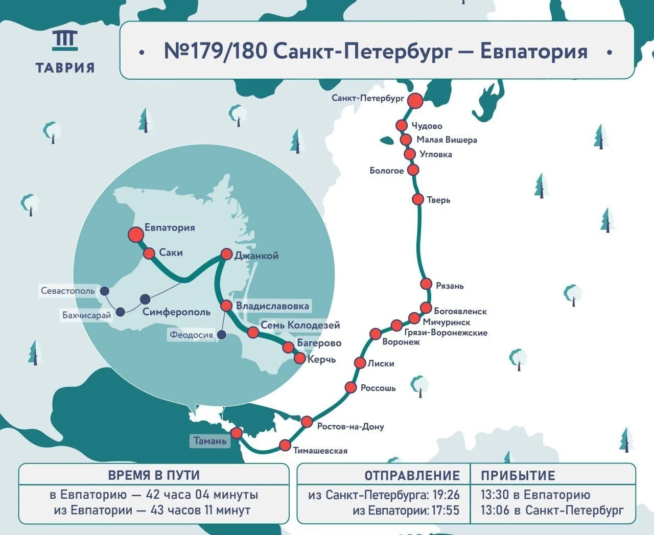 25 и 26 апреля поезд будет уходить из Петербурга в 19:47 и прибывать в Евпаторию через день в 13:30, сообщили в пресс-службе «Гранд Сервис Экспресс».